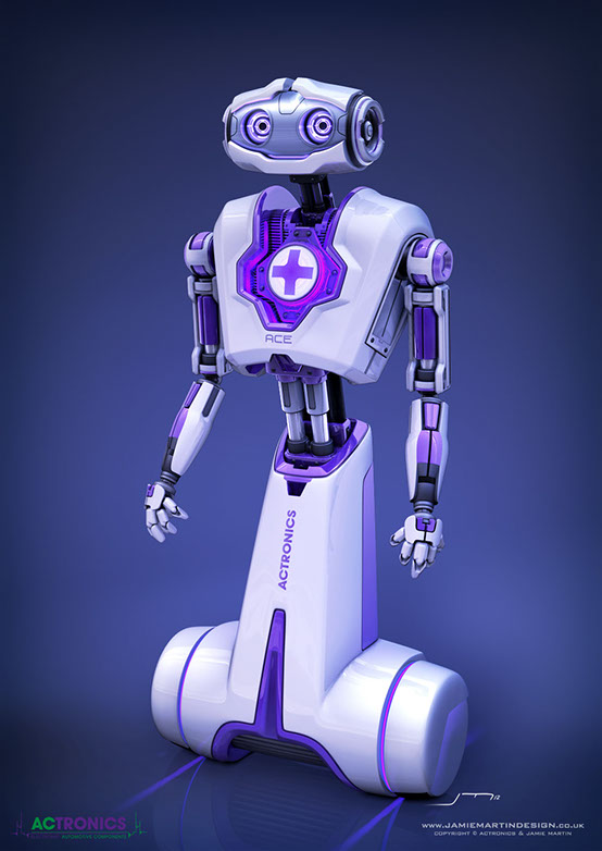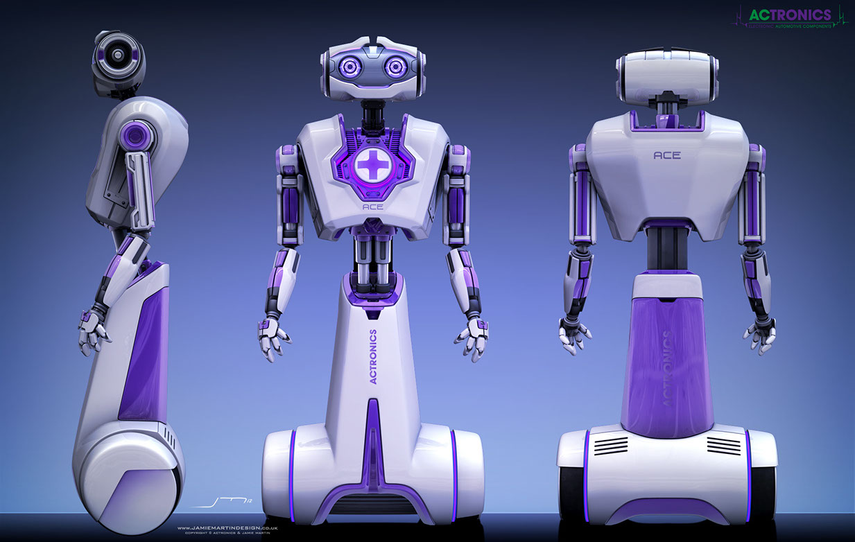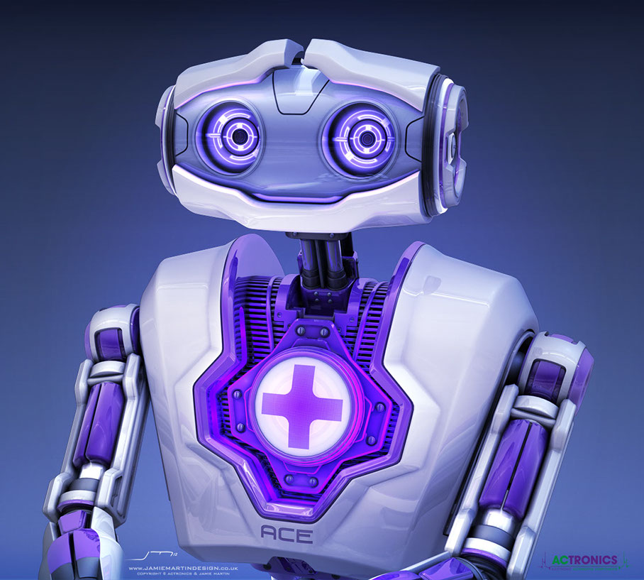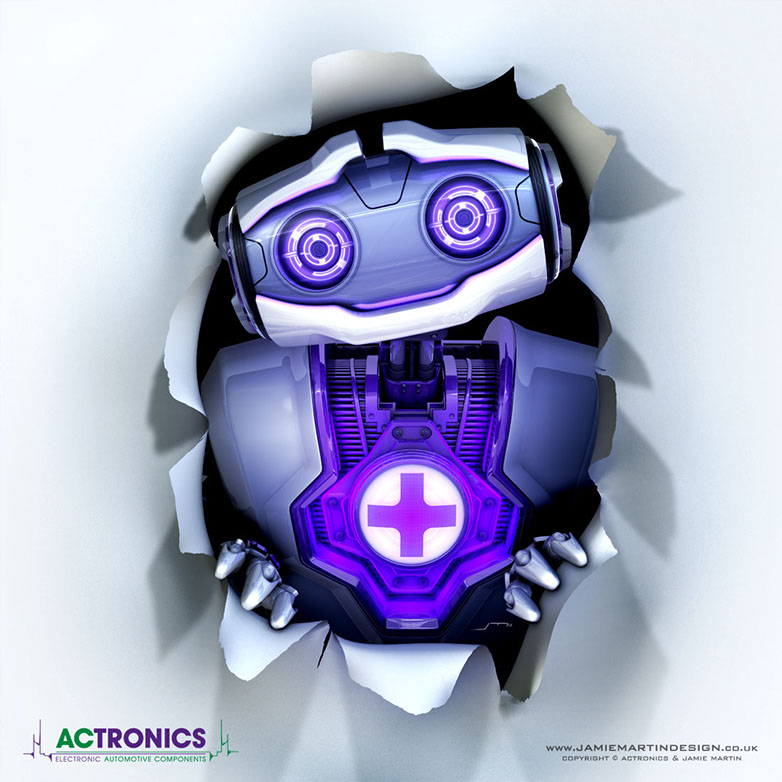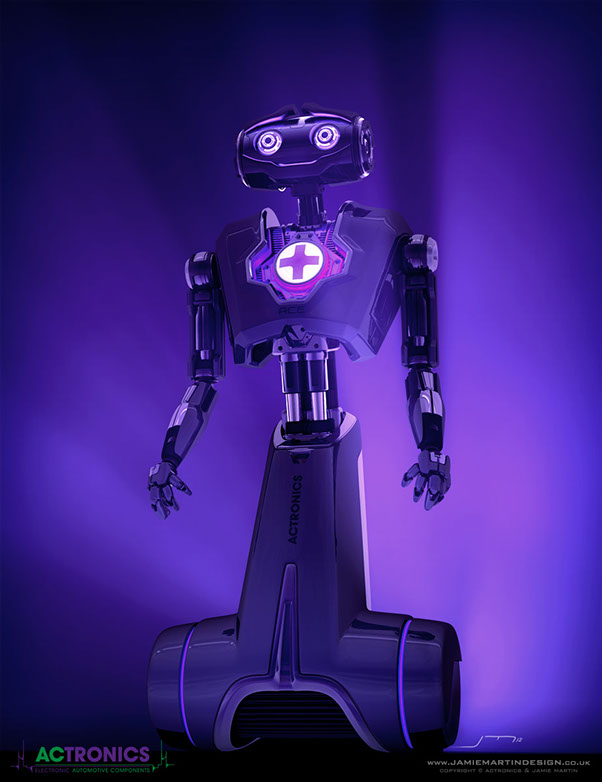 Designed as a robotic mascot and 'face' for automotive company 'ACtronics'. ACE is your likeable 'car doctor', able to fix any of your automotive needs with his in-built (rear mounted) toolbox and multi-purpose interchangeable hands. The client requested ACE feature the spherical 'ID4Motion' logo I had previously designed for them as his eyes, and that he had to immediately come across to their customers as "friendly". I decided to include wheels instead of legs for ACE, to emphasise the automotive link between him and his new owners.