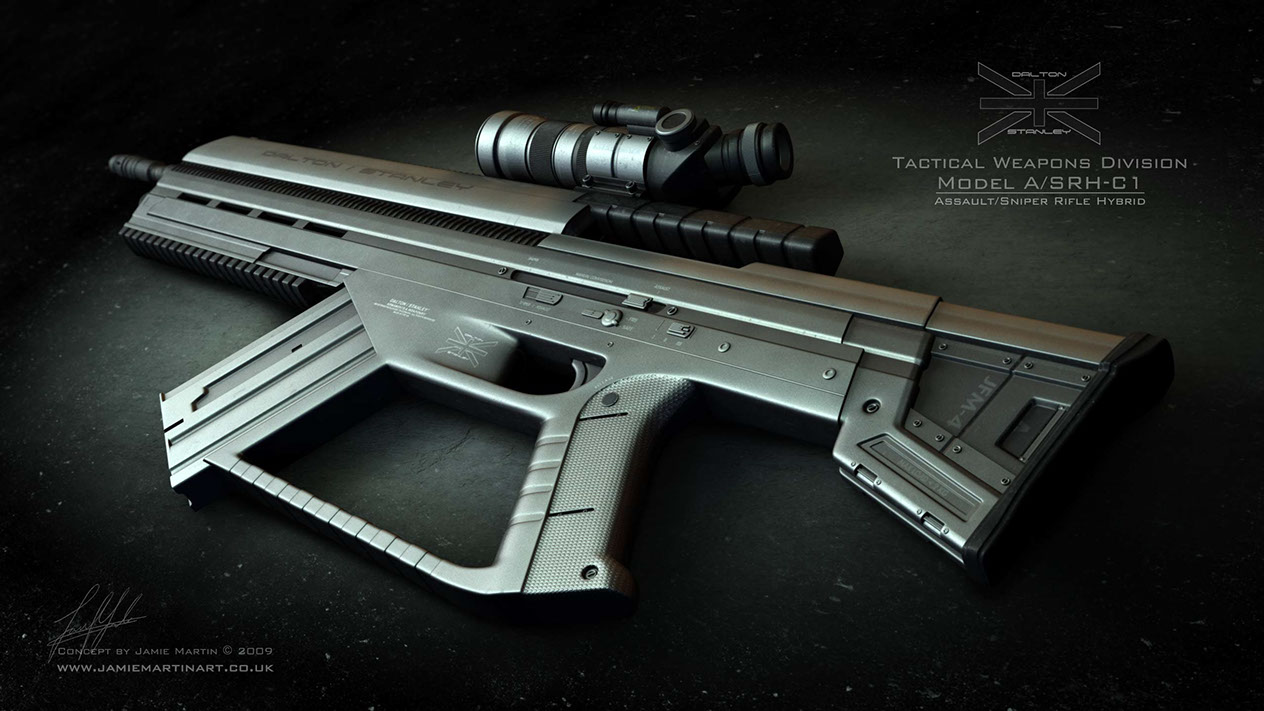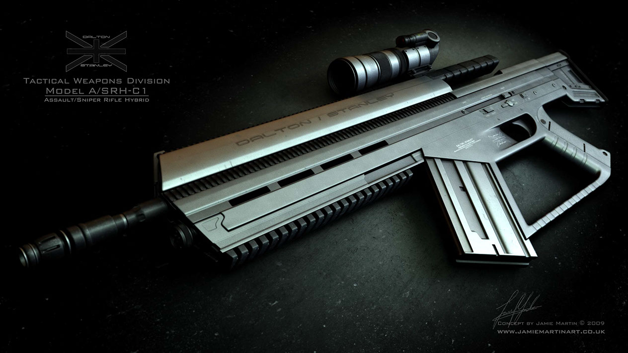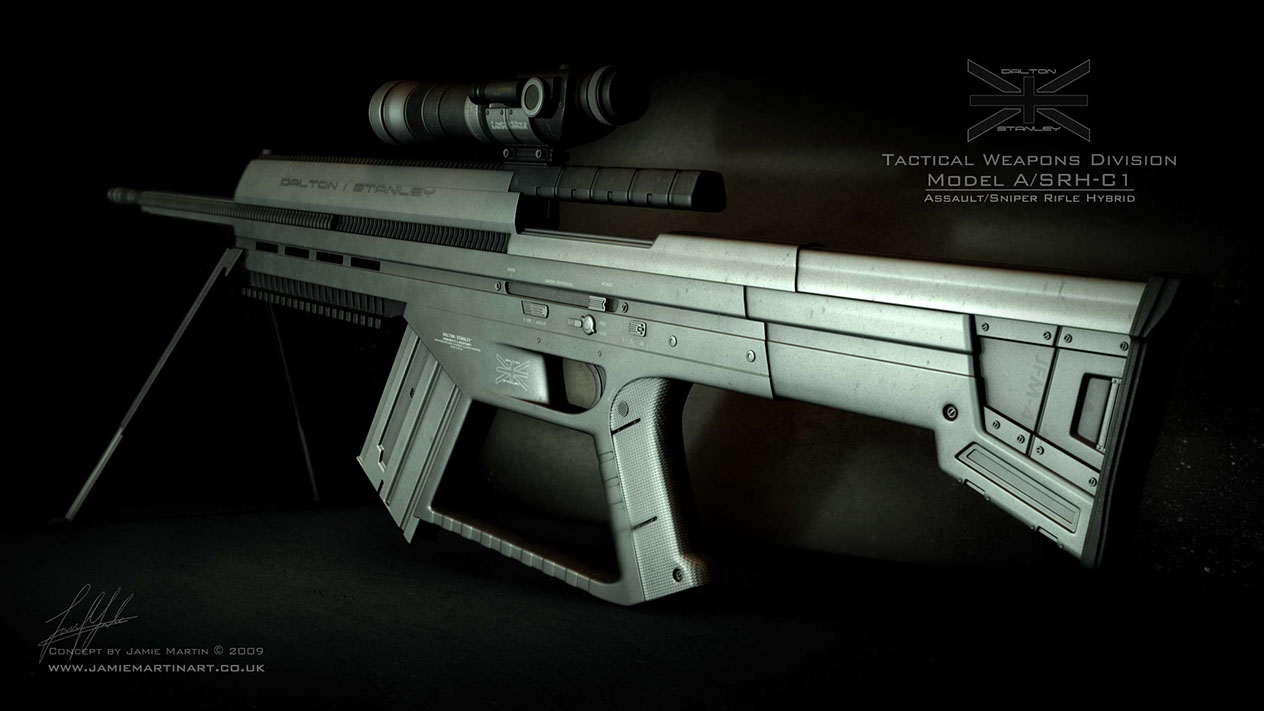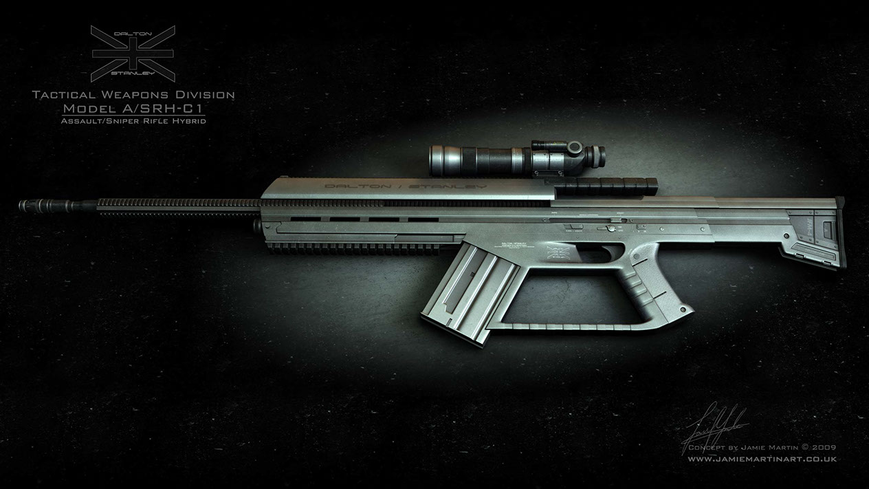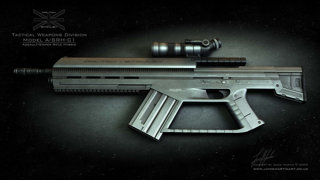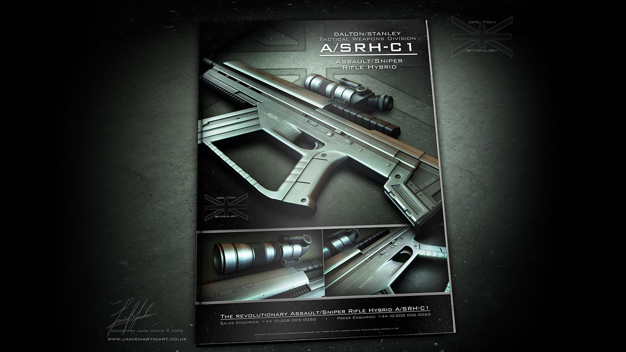 The A/SRH-C1 is the latest pioneering technology from renowned gun manufacturer Dalton/Stanley. It enables the user to alternate between 'Assault' and 'Sniper' modes depending on their environment and requirements. Primarily the weapon acts as a lightweight close-range Assault Rifle, but is able to automatically and conveniently convert into a medium-long range Sniper Rifle with computer-guidance laser triangulation capabilities. An on-board system allows the user to pin-point and lock-on to a designated target, where upon the built-in computer measures air particles passing through three invisible beams projected from the front of the weapon. The computer uses this information to calculate wind direction and velocity, resulting in it being able to provide the user with a more accurate alternative target for the shot, presented on the scope's viewfinder.