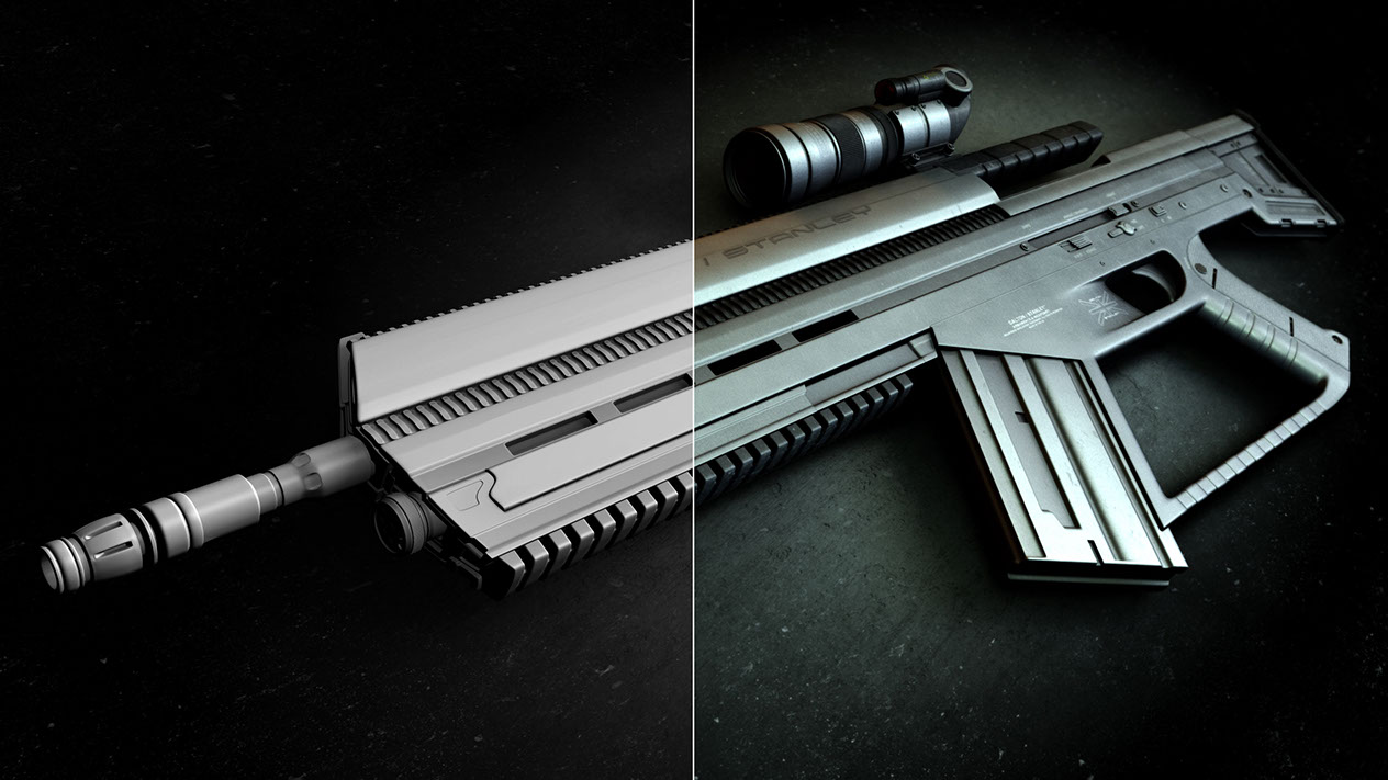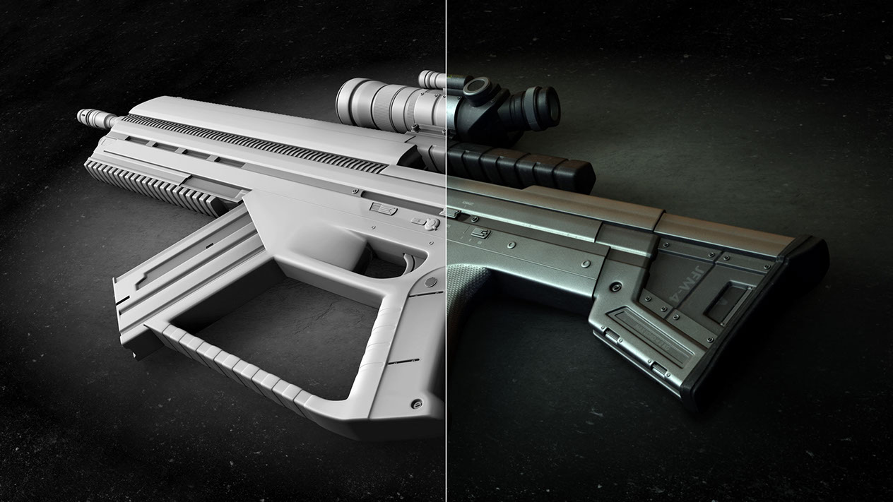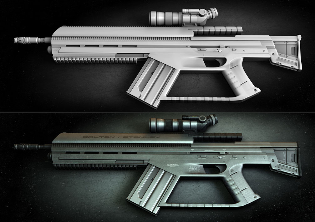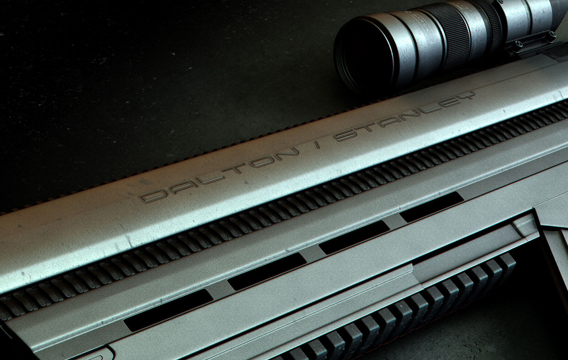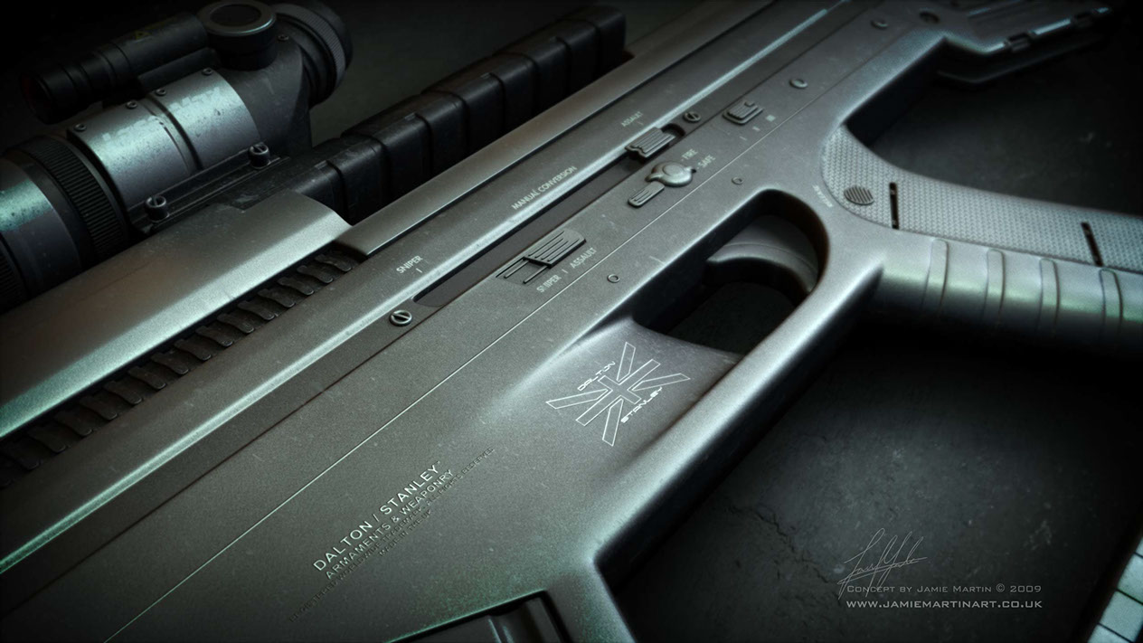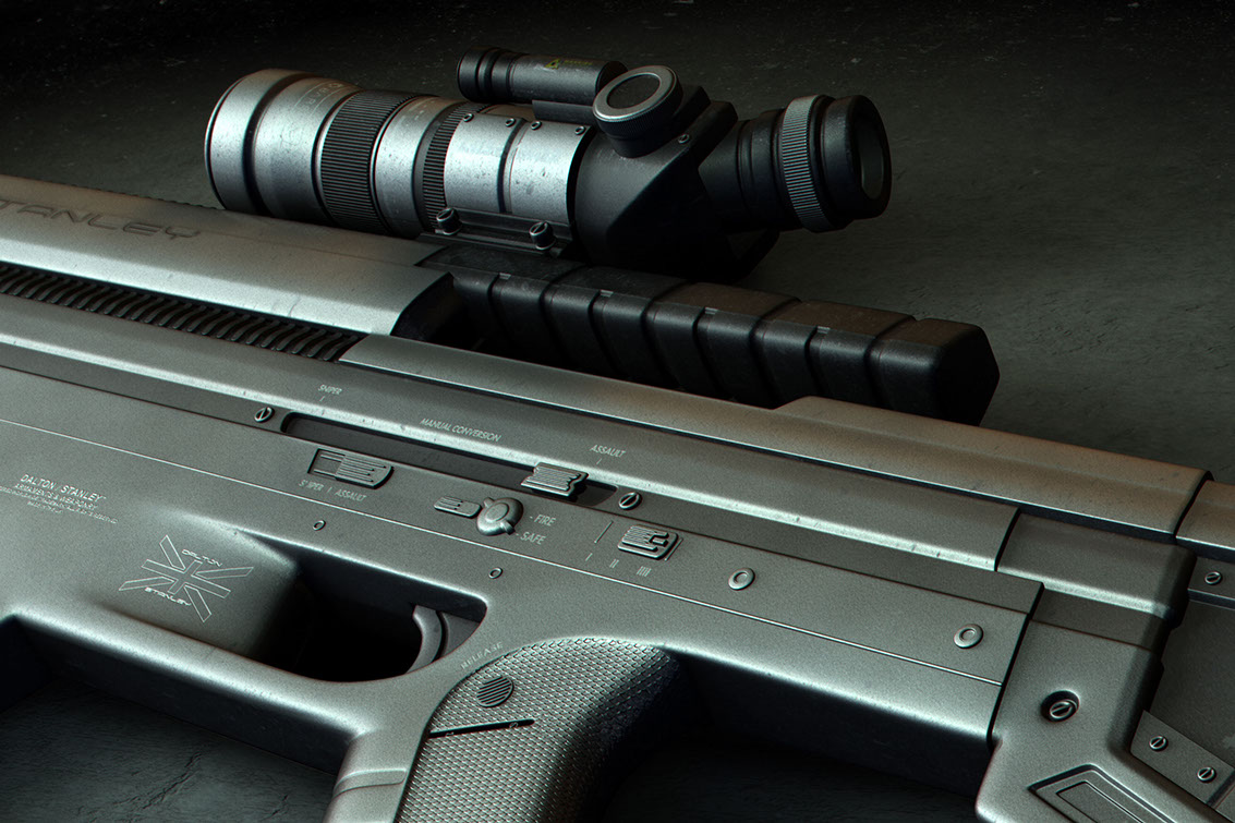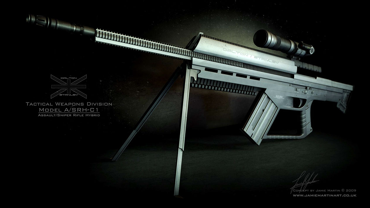 The A/SRH-C1 is the latest pioneering technology from renowned gun manufacturer Dalton/Stanley. It enables the user to alternate between 'Assault' and 'Sniper' modes depending on their environment and requirements. Primarily the weapon acts as a lightweight close-range Assault Rifle, but is able to automatically and conveniently convert into a medium-long range Sniper Rifle with computer-guidance laser triangulation capabilities. An on-board system allows the user to pin-point and lock-on to a designated target, where upon the built-in computer measures air particles passing through three invisible beams projected from the front of the weapon. The computer uses this information to calculate wind direction and velocity, resulting in it being able to provide the user with a more accurate alternative target for the shot, presented on the scope's viewfinder.