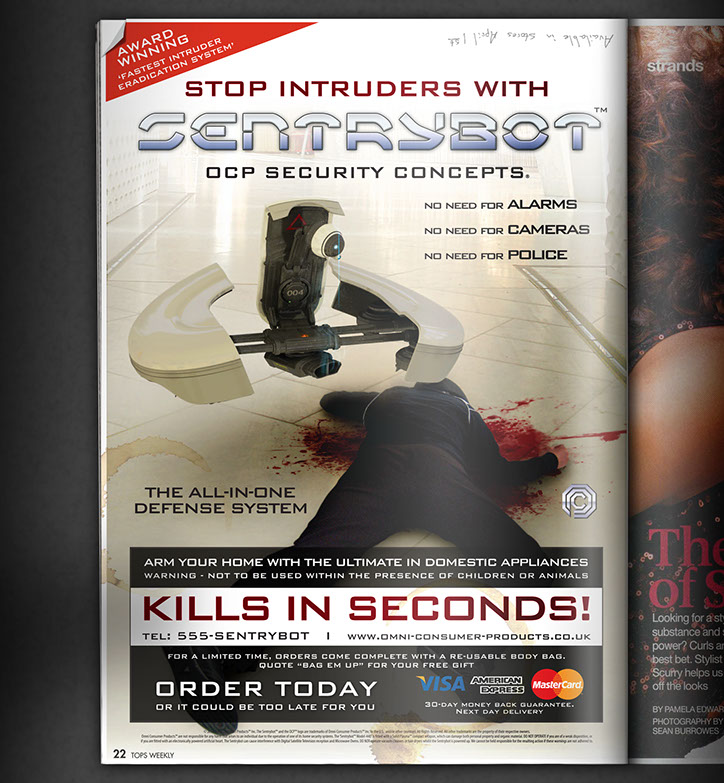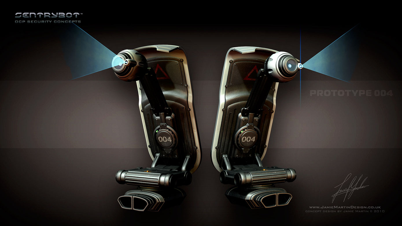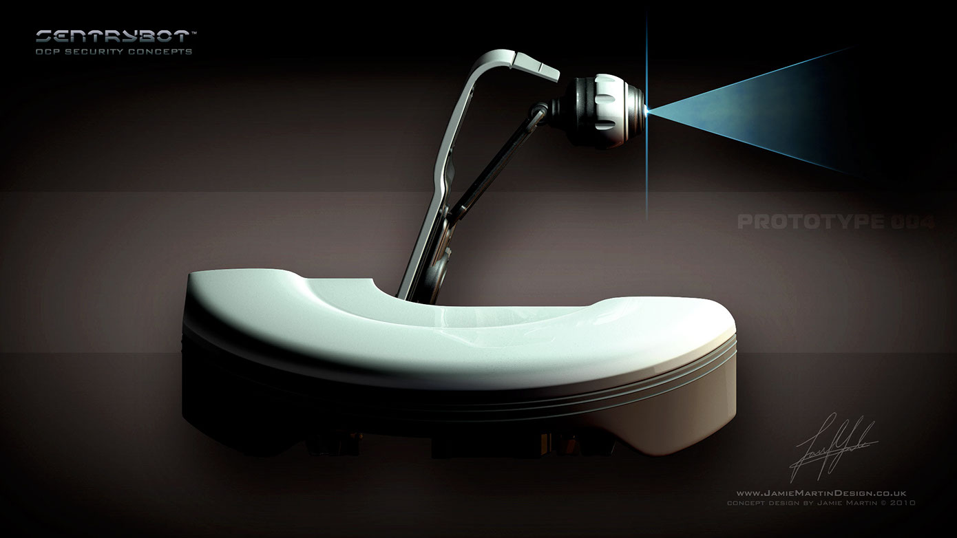 Eliminate your home security worries with the all-new Sentrybot defence system from Omni-Corp. Developed exclusively by Security Concepts, the Sentrybot entirely removes the need for alarms, CCTV or even Police intervention. Armed with a revolutionary (patented) Solid-Plasma compact weapon, intruders will be quickly and easily incapacitated by the Sentrybot's 'Intruder Recognition' tracking system, leaving minimal clean-up required afterwards. Its A.I. protection will keep you and your home safe from unwanted attacks, day & night. We feel, as we are sure will you, that your loved ones deserve to be protected only by the best. OCP's Sentrybot is that all-in-one solution.